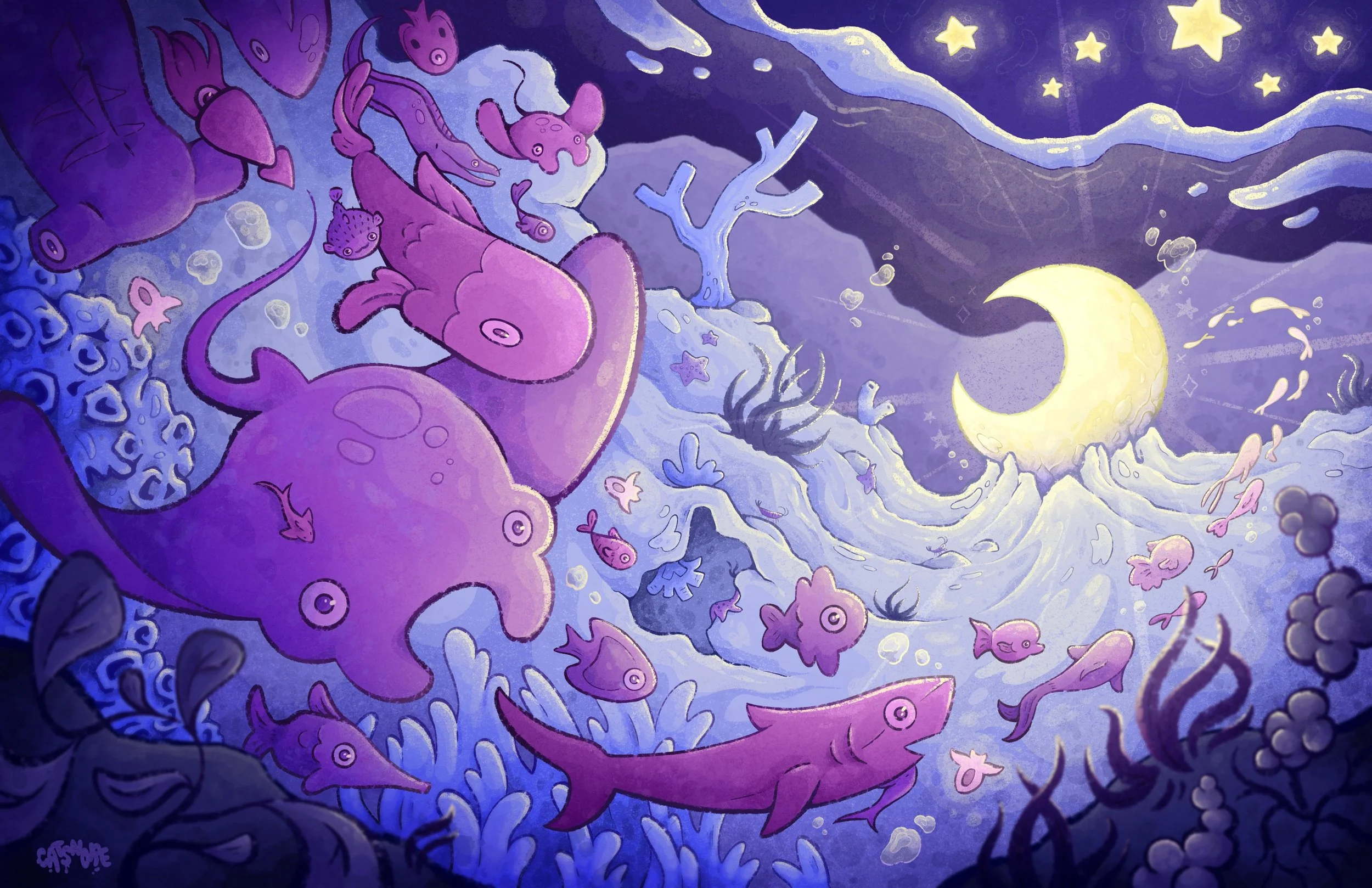 When the moon mysteriously crashes into the sea one starry night, all of the creatures of the deep come out to investigate and bask within the moon’s enchanting glow.