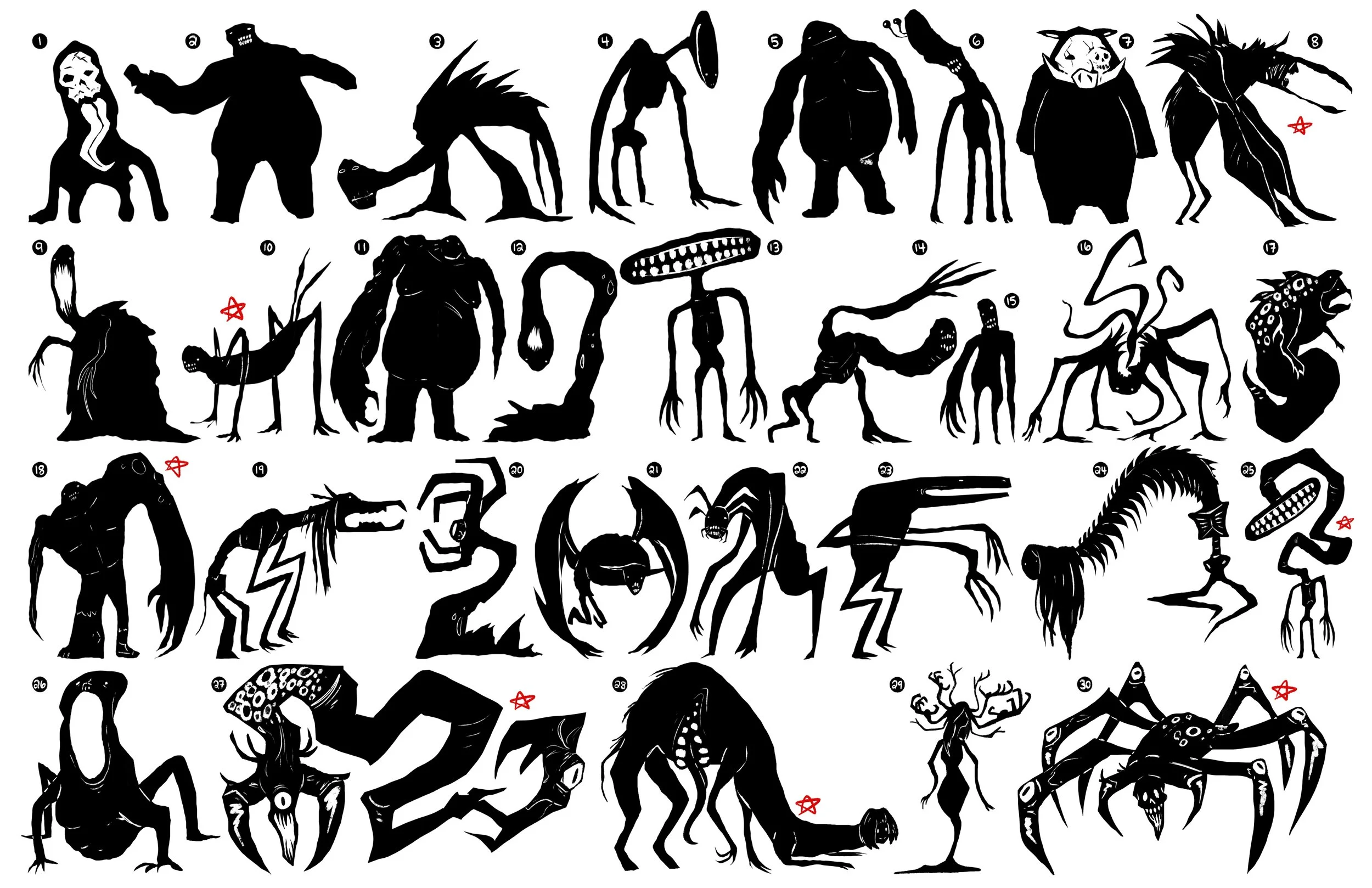 Before I even started to think of lore, the first step I took was creating rough silhouettes of different monstrous forms. This allowed me to get out as many ideas and shapes as possible in a rather short amount of time. From there, I then picked my favorites and continued to develop their designs. In the end, I ultimately went with the humanoid-bird-creature.
